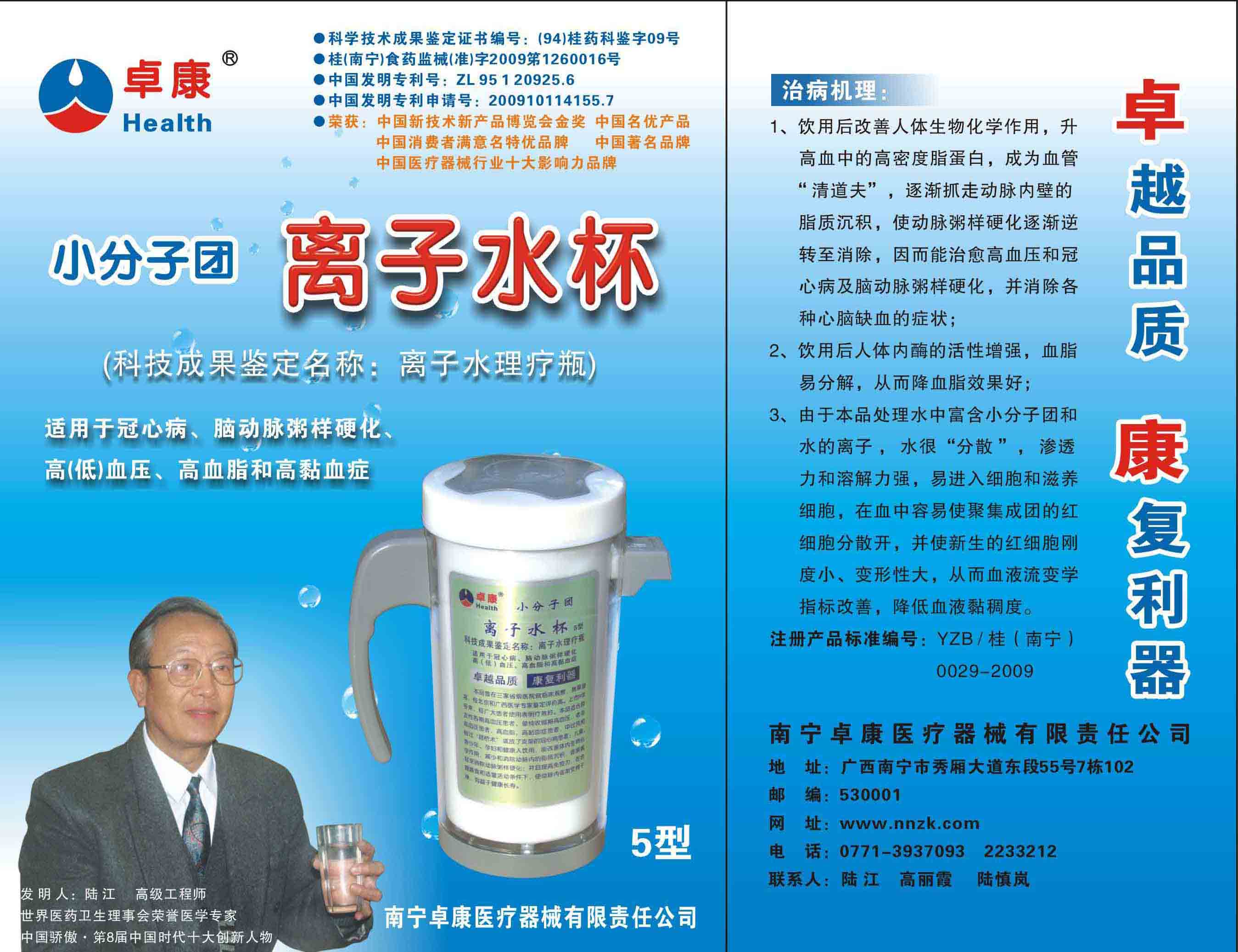 -----我是從事建筑的高工,本來沒有資格去攻克醫(yī)學(xué)難題,卻為了自身健康才扣響醫(yī)學(xué)的大門。由于我1990年患高血壓,因怕中風(fēng)才研究發(fā)明了離子水瓶,我把水處理成微小分子團(tuán)水,飲用后治愈了高血壓。便于1993年底送到三家省級(jí)醫(yī)院做臨床試用4個(gè)月。經(jīng)北京和廣西醫(yī)學(xué)專家鑒定:"降脂降壓效果好"," 能擴(kuò)大心腦動(dòng)脈流量,改善心腦電圖以及微循環(huán)","對(duì)治療心腦動(dòng)脈粥樣硬化、高血壓、高血脂有良好的醫(yī)療保健作用。""產(chǎn)品的技術(shù)性能和療效達(dá)到了同類產(chǎn)品的國內(nèi)領(lǐng)先水平,經(jīng)廣西醫(yī)學(xué)科學(xué)情報(bào)研究所檢索,未見國外有類似報(bào)道。"中國醫(yī)學(xué)科學(xué)院張正國教授從美國國立醫(yī)學(xué)圖書館數(shù)據(jù)庫存Medline檢索英俄文資料,均未見類似報(bào)告。2000年上市后,我為了對(duì)消費(fèi)者負(fù)責(zé)而繼續(xù)觀察研究,一直通過《信譽(yù)卡》和《質(zhì)量跟蹤調(diào)查書》向患者承諾療效,請(qǐng)用戶使用6個(gè)月后反饋效果。和脂壓患者飲用2至5個(gè)月內(nèi),消除癥狀,停服藥物,血壓正常;冠心病患者飲用3~5個(gè)月逐漸減輕至消除心絞痛、房顫等癥狀,不再服藥,飲用1年左右心電圖正常,經(jīng)冠脈造影掃描無明顯狹窄,表明冠心病痊愈。大量患者還反映許多衰弱器官被修復(fù),讓前列腺增生、慢性咽喉炎、慢性氣管炎、支氣管炎、慢性胃炎、腸炎和膽囊炎等不藥而愈;2型糖尿病患者是因?yàn)橐葝u衰弱致病,飲用該水半年至一年,逐漸減藥至停藥,血糖尿糖正常,真正治愈2型糖尿病。中風(fēng)后遺癥患者飲用六七個(gè)月,可逐漸減輕至消除肢體和語言障礙,表明飲用該水能讓壽命很長(zhǎng)的神經(jīng)元細(xì)胞逐漸修復(fù),奇跡般地恢復(fù)肢體和語言功能。飲用后還使胸腺和脾臟兩個(gè)重要的免疫器官被修復(fù)和增強(qiáng),產(chǎn)生免疫細(xì)胞多,提高了免疫力,使人不生病或少生病。自此, 飲用微小分子團(tuán)水創(chuàng)造了攻克冠心病、高(低)血壓和糖尿病三大醫(yī)學(xué)難題的奇跡。人們對(duì)此感到不可思議,但實(shí)踐是檢驗(yàn)真理的唯一標(biāo)準(zhǔn)。